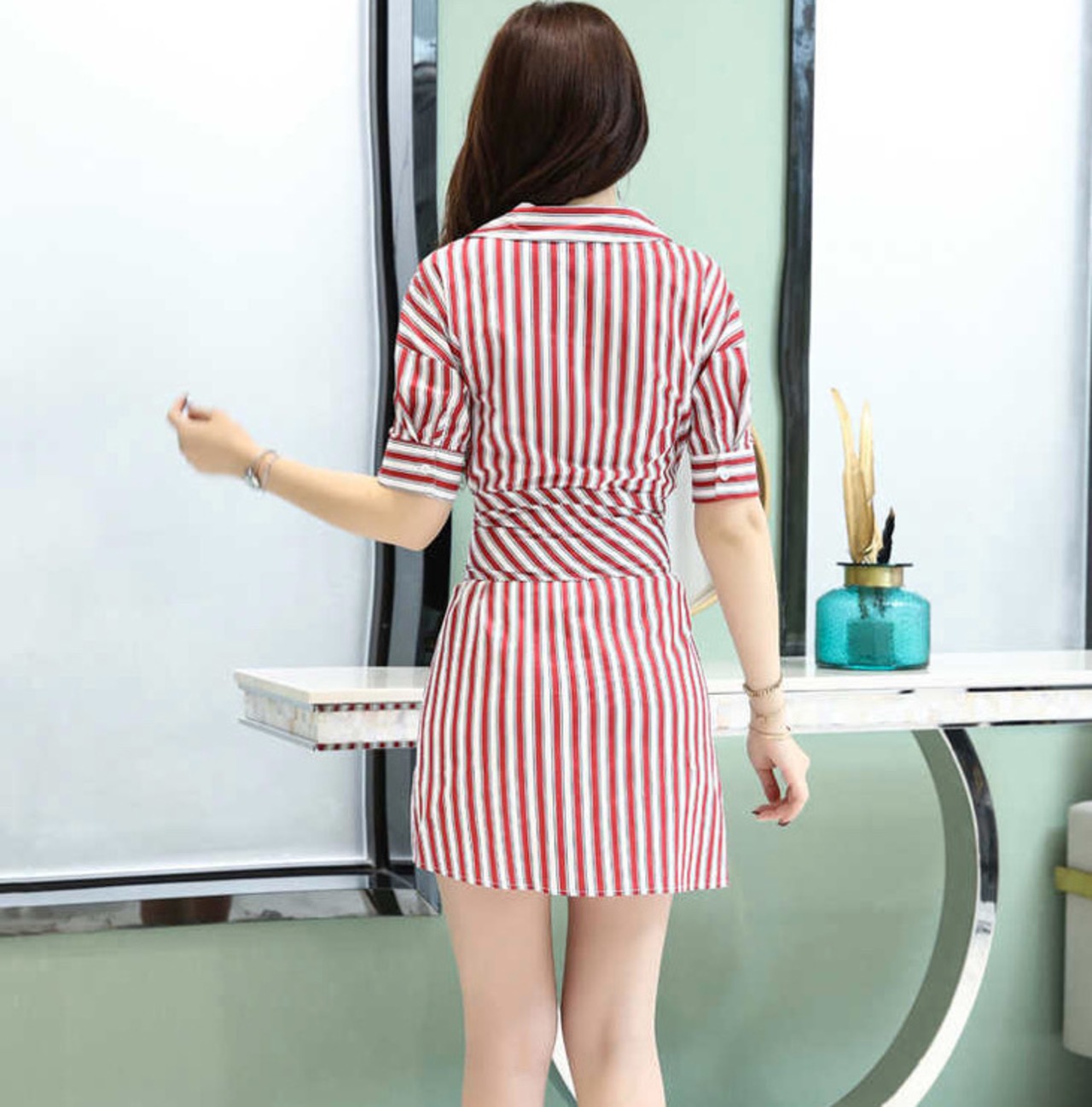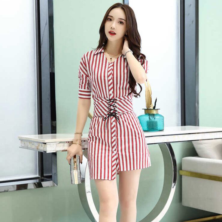 ストライプシャツワンピース ウエストレースアップでキレイめスタイル! C30002