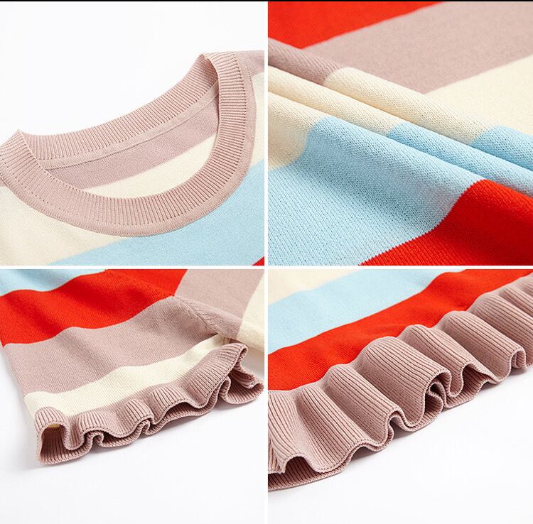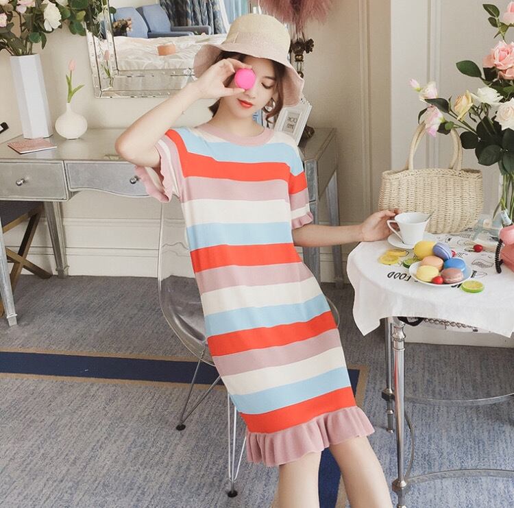 袖と裾のフリルが可愛い!レトロなカラフルボーダーのニットワンピース♪ C30135