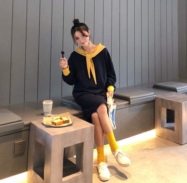2018秋冬新作!トレンドのマスタードカラー♪フード付き膝丈セーラーワンピース☆ C30358