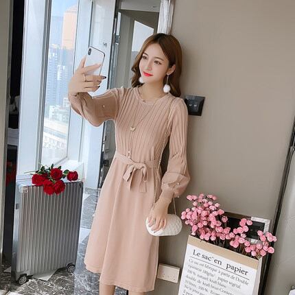 2018秋冬新作 フレアワンピース ひざ丈 長袖 クルーネック 女子会 フェミニン F60037