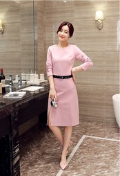 長袖スリットワンピース♪ ラウンドネック 単色 デート 女子会 お呼ばれ 結婚式二次会 H80087