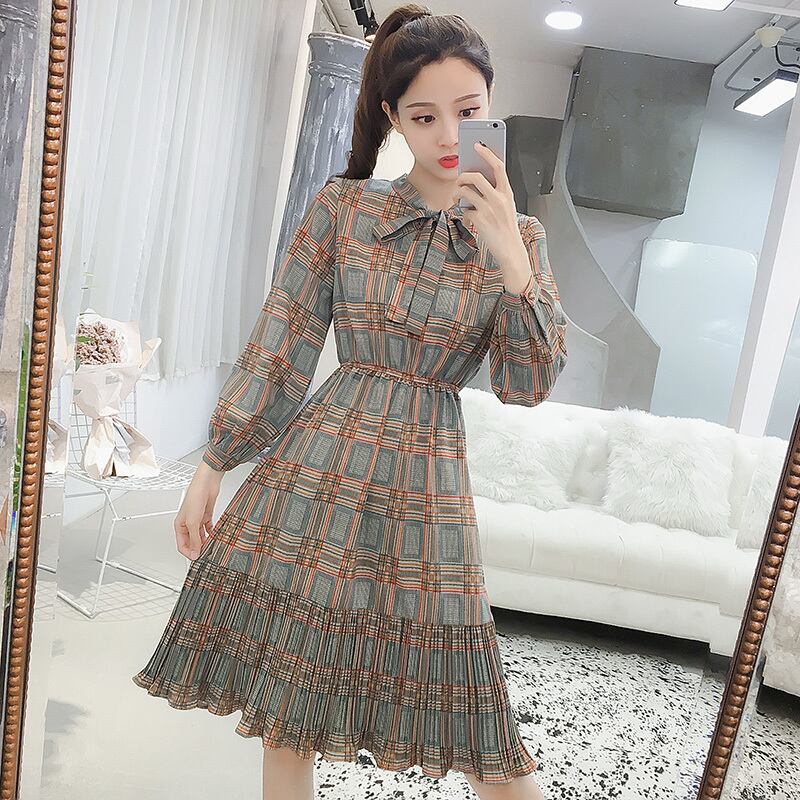 レトロなひざ丈チェック柄ワンピース♪ 長袖 プリーツワンピース デート 女子会 おでかけ H80229