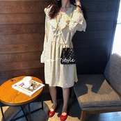 ボリューム袖ドット柄ひざ丈シフォンワンピース♪
