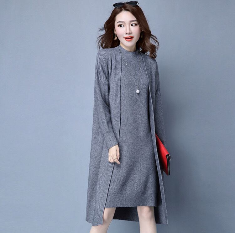 シンプルなデザインながら、落ち着いた大人の印象を与えるニットワンピースとカーディガンのセットアップ♪