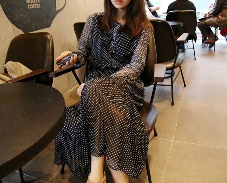 2018秋冬新作!チェックとドッドの組み合わせオシャレなワンピース×重ね着用オーバーサイズロングニットのセットアップ♪
