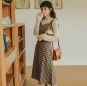 2018秋冬新作!ブラウンのギンガムチェックが落ち着いた優しいイメージを与える、膝下丈ストラップワンピース♪