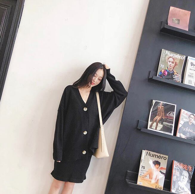 2018秋冬新作!大きめボタンがアクセントのVネックカーディガン×膝上丈ニットスカートのセットアップ♪