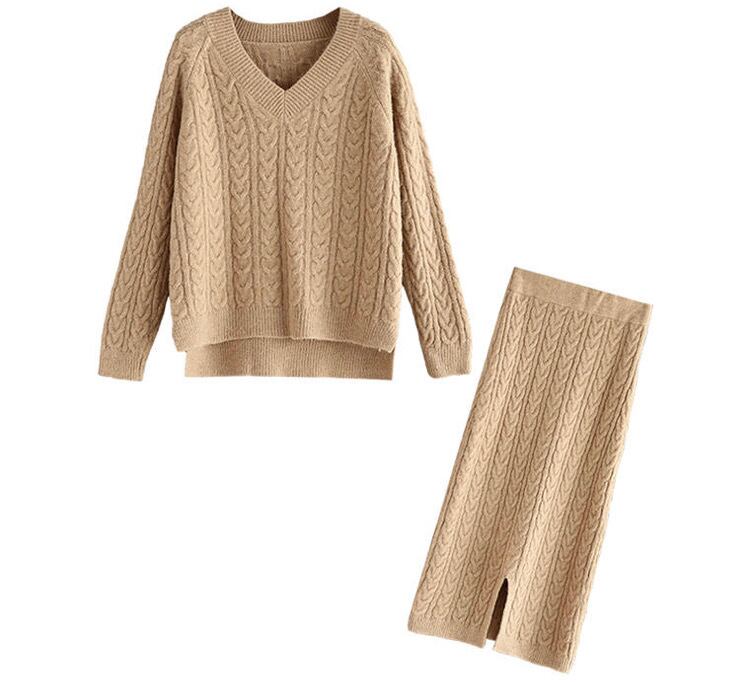 2018秋冬新作!清楚で気品のある、ケーブル編みVネックニットセーター×ニットペンシルスカートのセットアップ♪ C30622