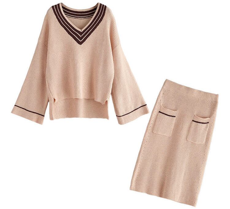 2018秋冬新作!清楚で気品のある、フレアスリーブのVネックニットセーター×前ポケットつきニットペンシルスカートのセットアップ♪