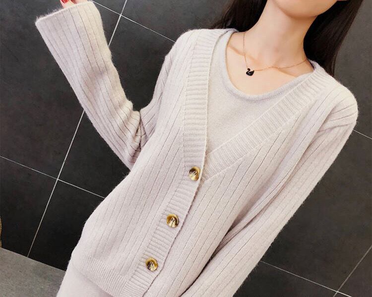 2018秋冬新作!清楚で気品のある、ノースリーブニットワンピース×Vネックリブ編みカーディガンのセットアップ♪