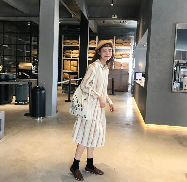 2018秋冬新作!トレンドのレトロスタイル☆落ち着いたデザインの、ストライプシャツワンピース♪ C30674