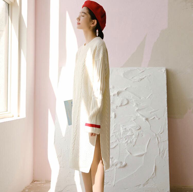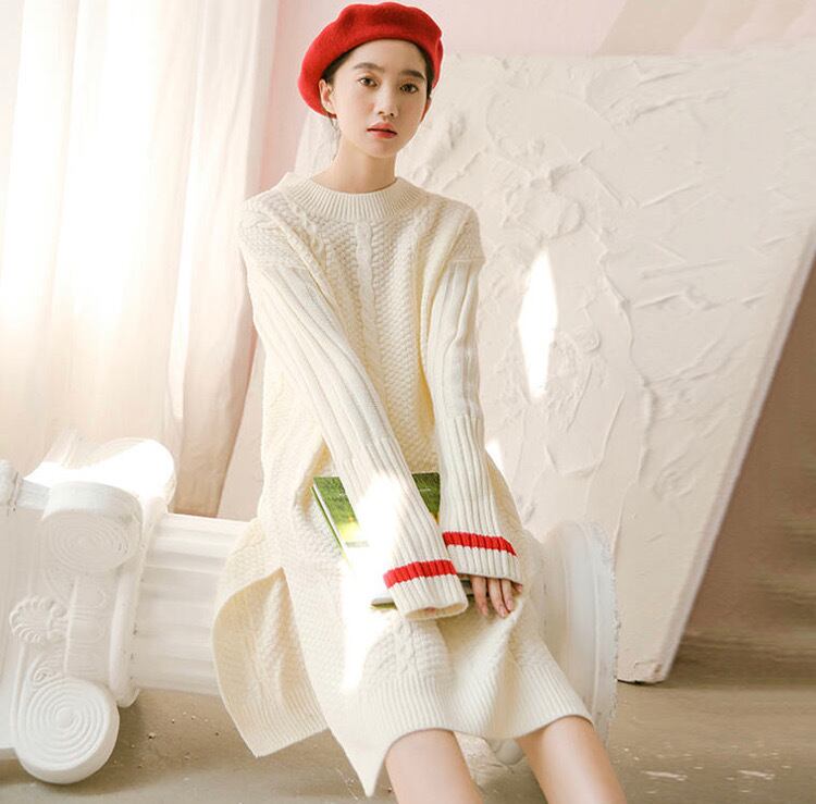 2018秋冬新作!トレンドのレトロスタイル☆ケーブル編みがオシャレな、スリット入り、ラウンドネックニットワンピース♪ C30681