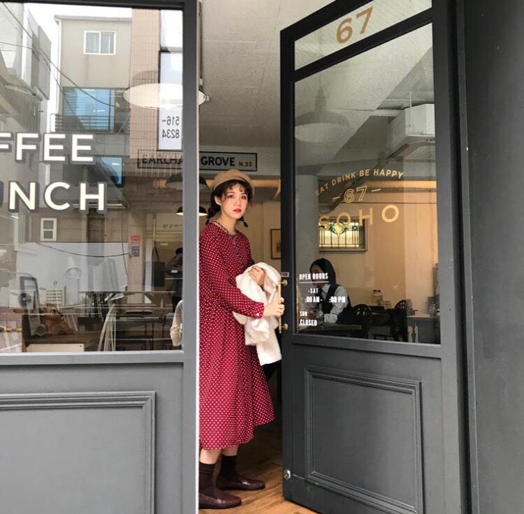 2018秋冬新作!トレンドのレトロスタイル☆清楚で気品のある、ラウンドネック、ポルカドッドの膝下丈ワンピース♪ C30689