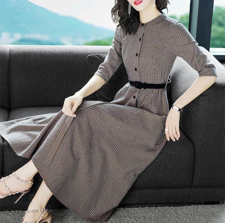 2018秋冬新作!トレンドのチェック☆清楚で気品のある、ベルト付き、五分袖ラウンドネックのチェックワンピース♪S〜2XLまで C30749