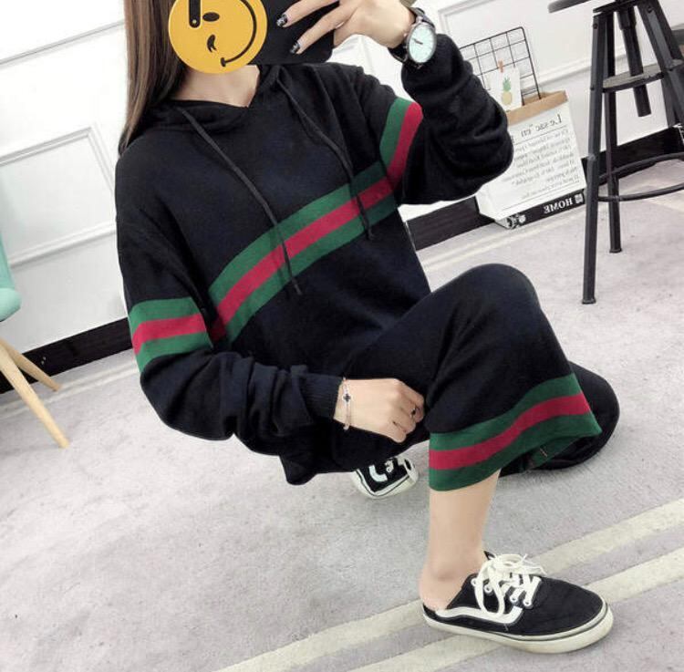 スポーツカジュアル(スポカジ)スタイル☆北欧風のラインがオシャレな、フード付きニットとニットワイドパンツのセットアップ♪ C30803