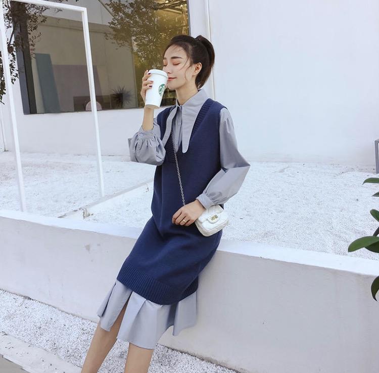秋冬新作!トレンドのレトロ☆Vネックのロングニットベスト×襟のデザインがオシャレなシャツワンピース、清楚なコーデセット♪C30856