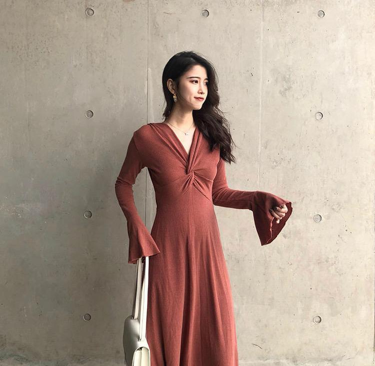 2018秋冬新作!クロスオーバーされた胸元とベルスリーブが女性らしい、清楚で気品のある長袖ロングワンピース♪