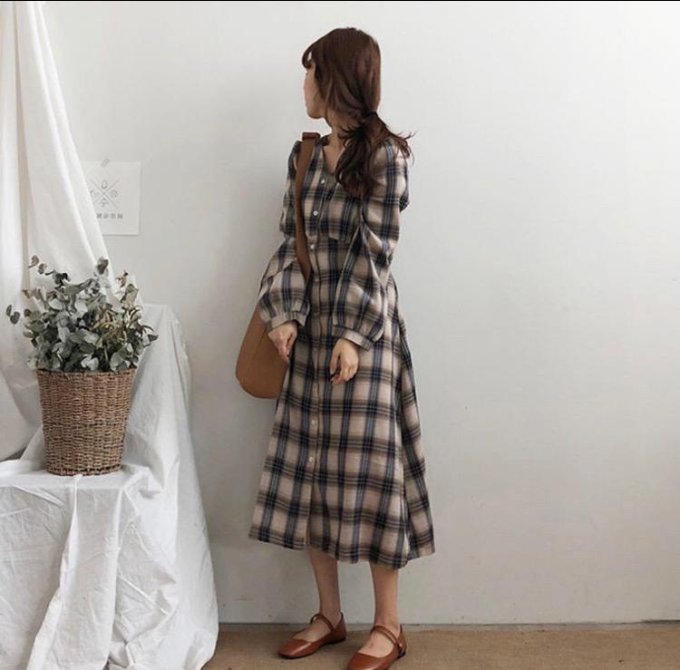 2018秋冬新作!Vネック&前ボタンで落ち着いた女性らしさが際立つ、レトロチェック柄ワンピース♪