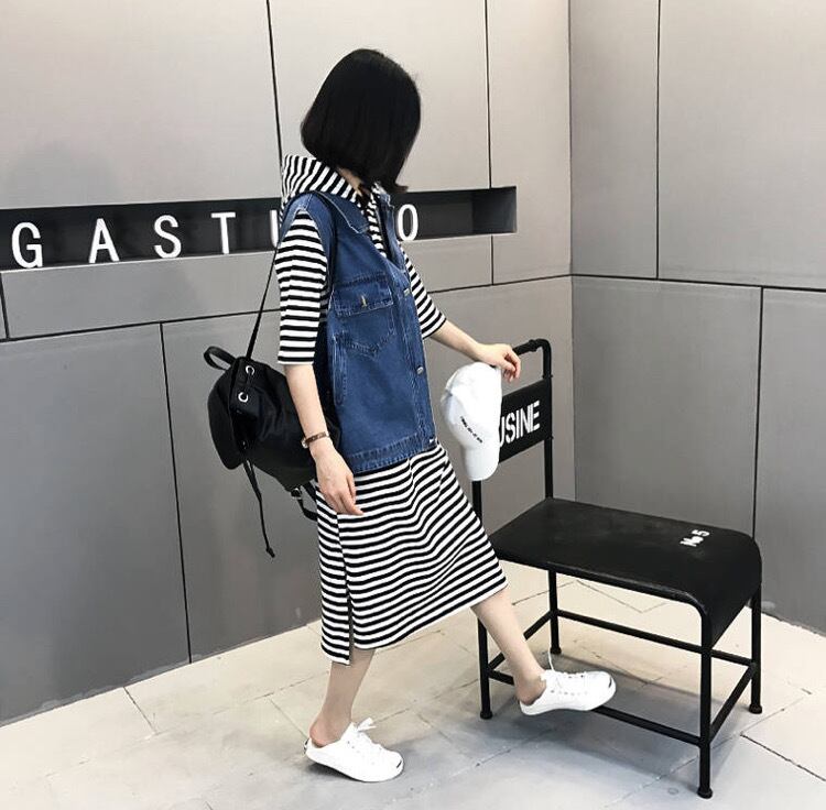 2018秋冬新作!フード付きボーダーワンピース×黒デニムベストのセットアップ♪